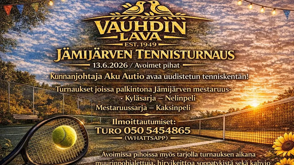 Tule myymään uutta tai vanhaa tavaraa. Tenniskentän avajaiset ja turnaus! Kyläsarja-nelinpeli, Mestaruussarja-Kaksinpeli. Ilmoittautumiset Turo: 050 545 4865. Kahvio ja soppatykistä hirvisoppaa tarjolla, muurinpohjaletut Elävää musiikkia ja lavatunnelmaa!